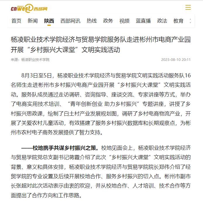 8月3日至5日,杨凌职业技术学院经济与贸易学院文明实践活动服务队16名师生走进彬州市乡村振兴电商产业园开展“乡村振兴大课堂”文明实践活动。服务队成员通过走访调研、咨询指导、座谈交流、专家讲座等方式,举办了电商实用技术培训、“青年创新创业 助力乡村振兴”专题讲座,讲授了乡村振兴思政课,绘制了白土村产业发展规划图,调研了乡村电商物流产业,开展了关爱农村儿童活动,有效搭建了服务乡村振兴数据库和长期观察点,为彬州市农村电子商务发展提供了智力支持。